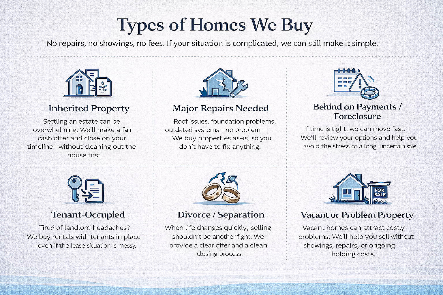 We offer a straightforward cash solution for homeowners who want speed and certainty. We purchase properties in their current condition, with no repairs, showings, or agent commissions required. This option works best for sellers who value convenience and a fast closing timeline.